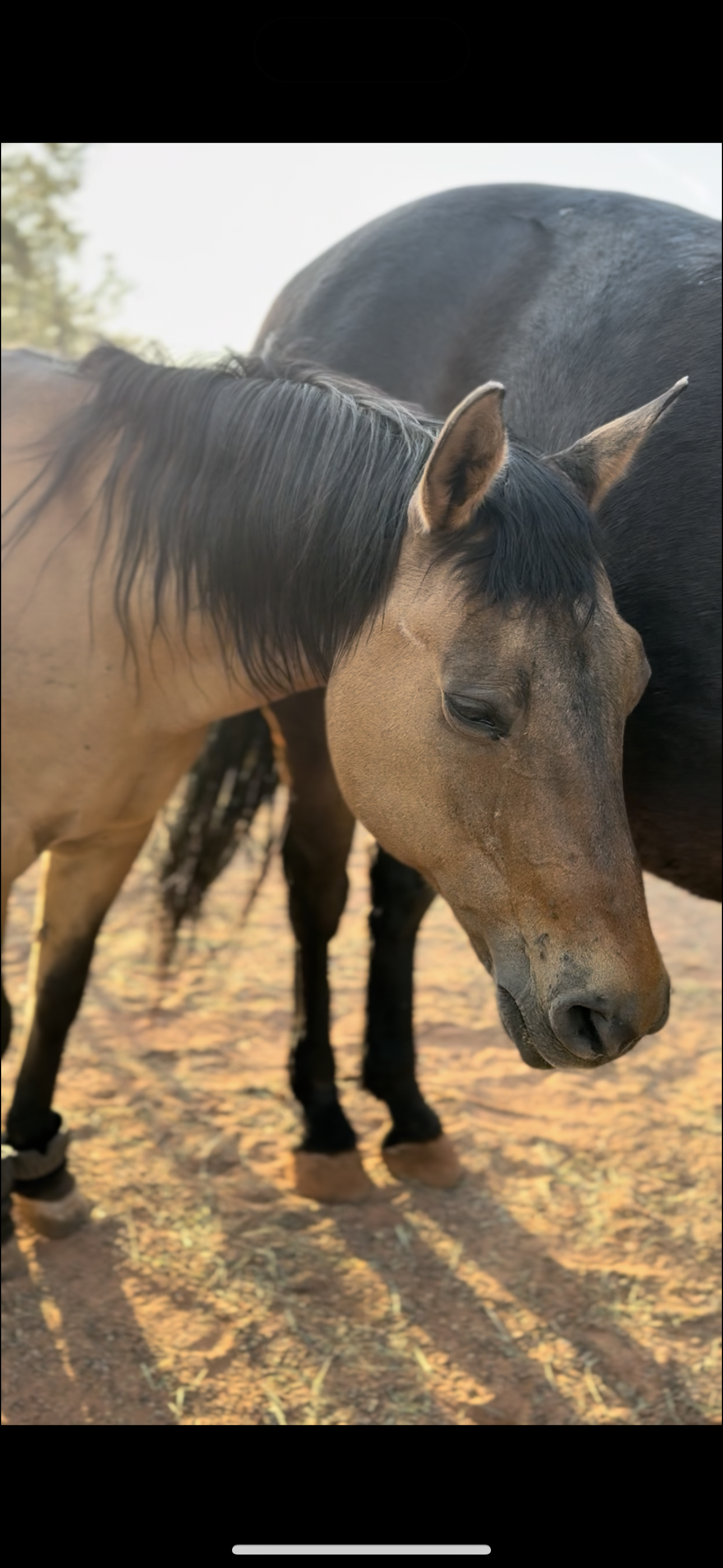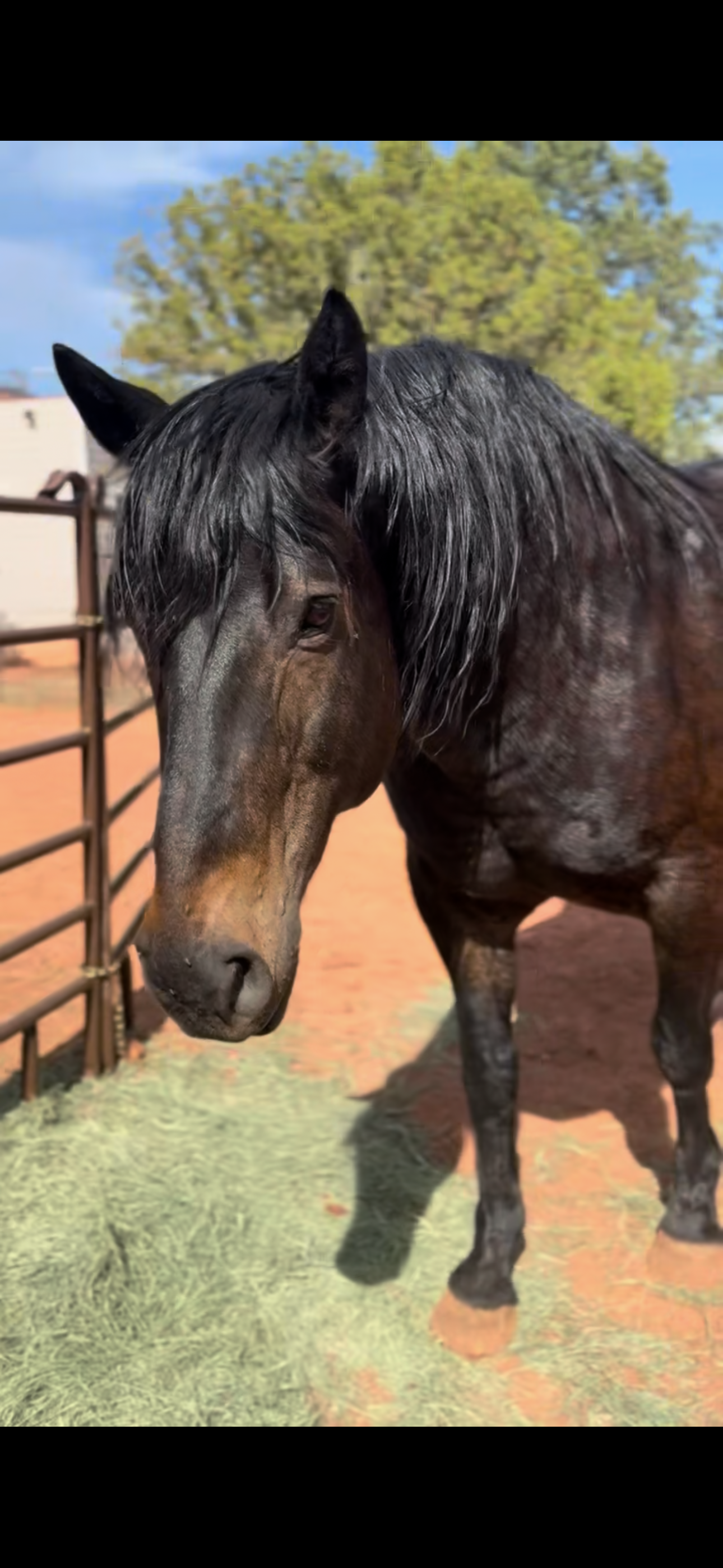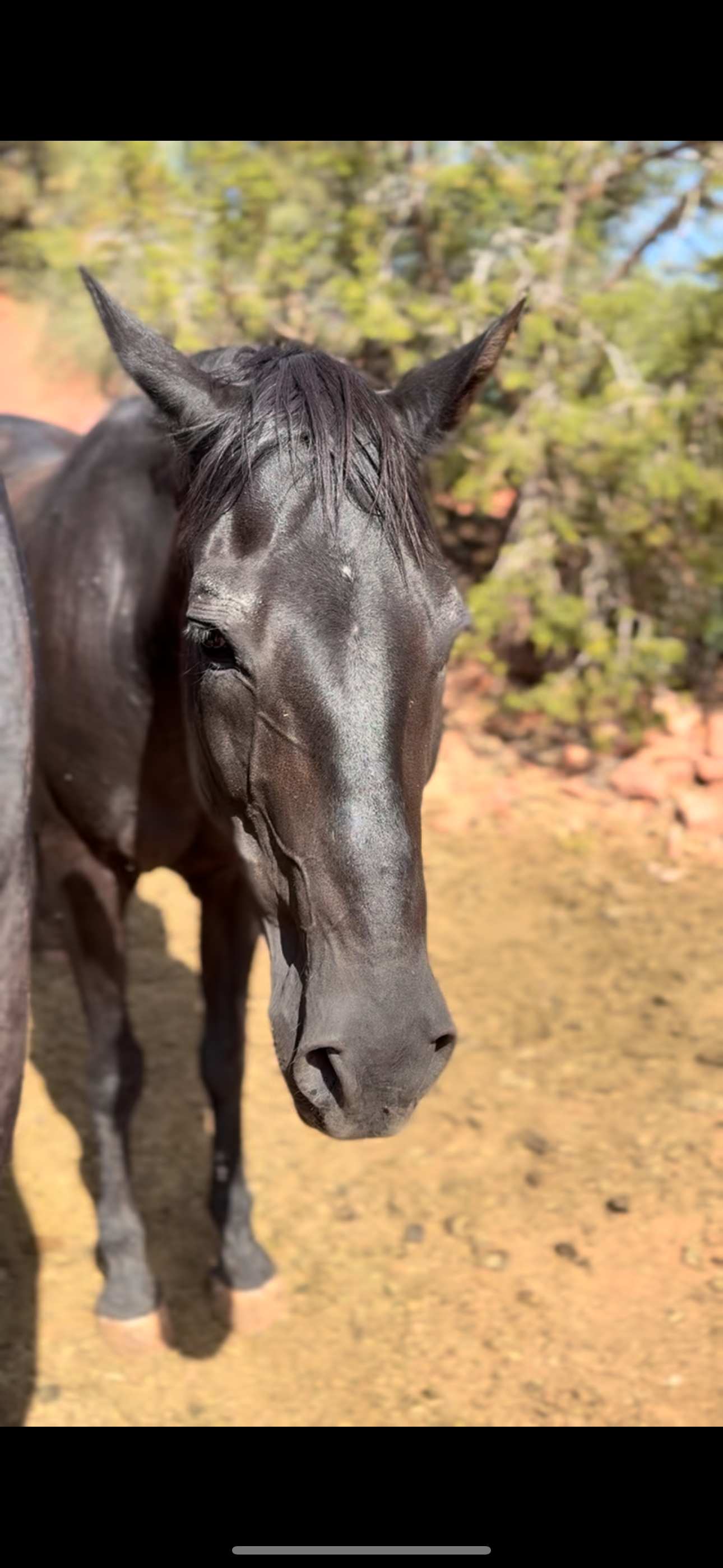 Background: Adopted from Excalibur in Las Vegas, Caruso once starred as the evil villain’s horse in the Tournament of Kings show. Now in Sedona, he’s traded jousting for healing, bringing his larger-than-life energy to the herd at home.