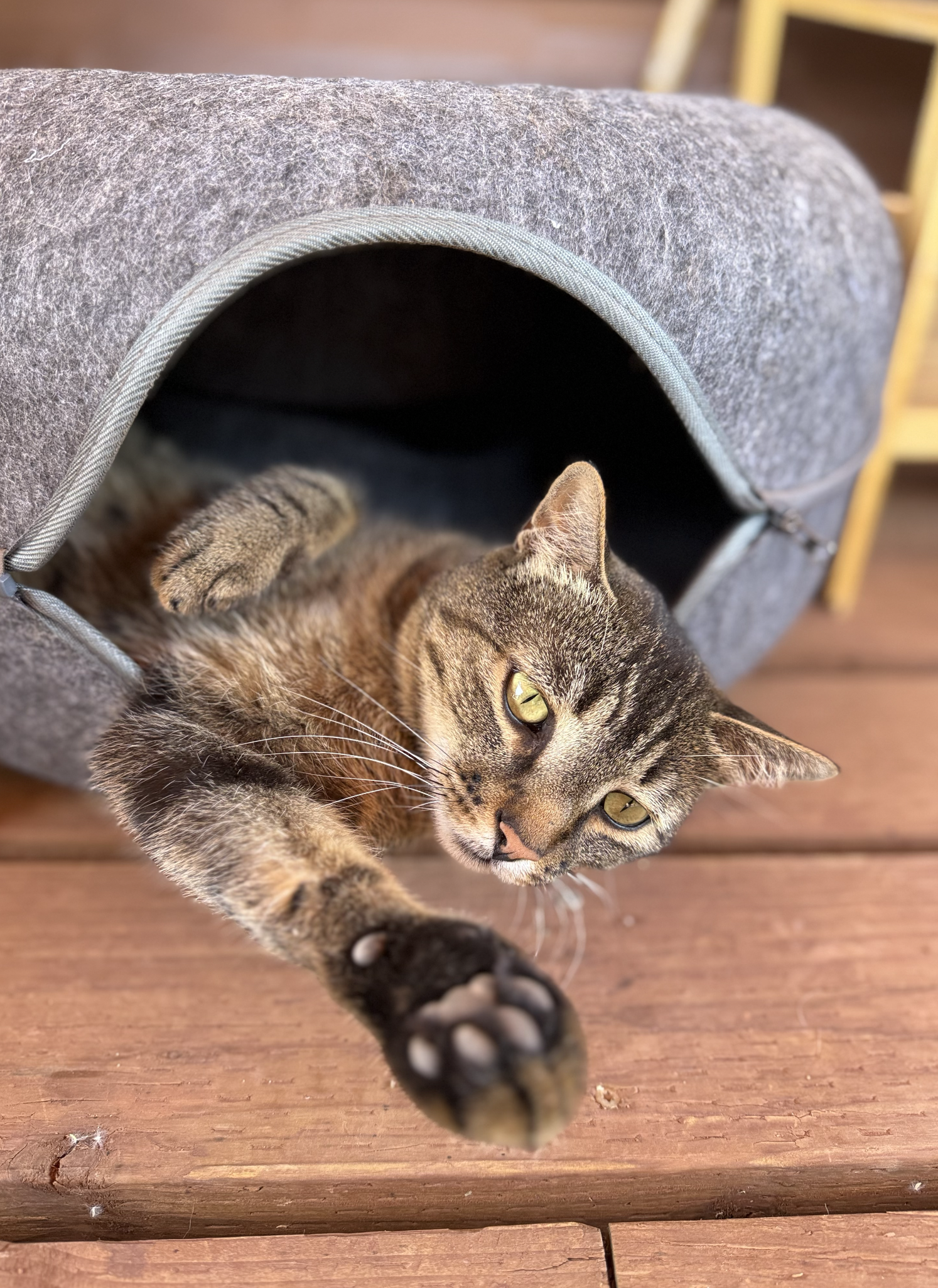 Background: Myrrh’s unique upbringing among dogs has shaped his bold, dog-like personality. His favorite pastime is getting rambunctious with Cookie, the Blue Heeler mix, in playful wrestling matches that blur the line between cat and canine. Despite his doggy antics, Myrrh’s keen instincts make him a masterful hunter, prowling with precision and pride.